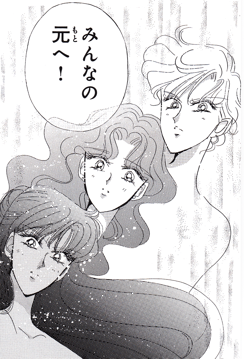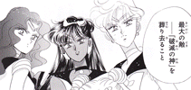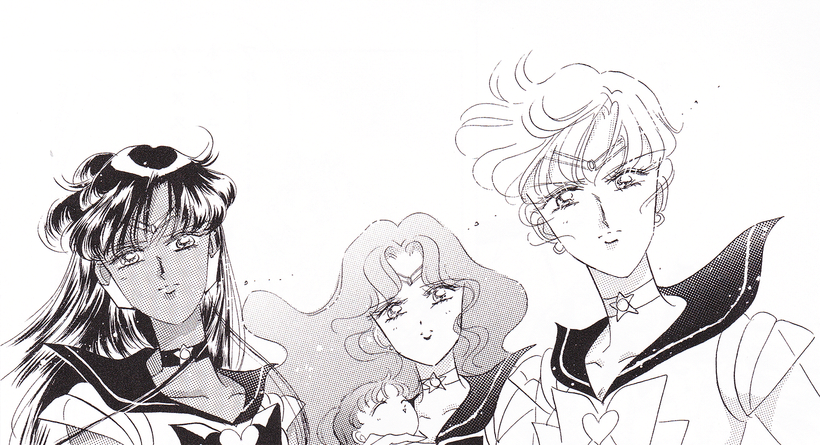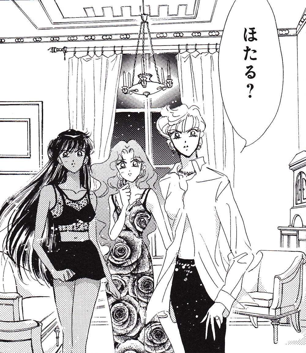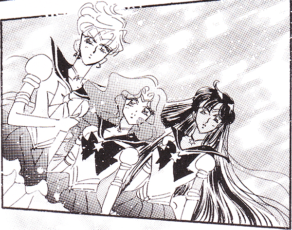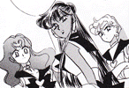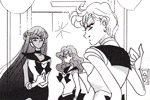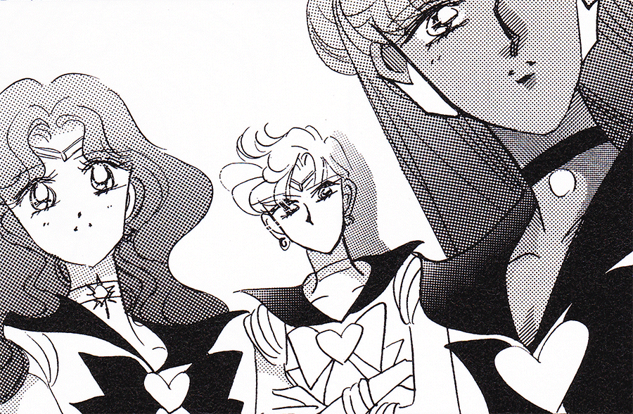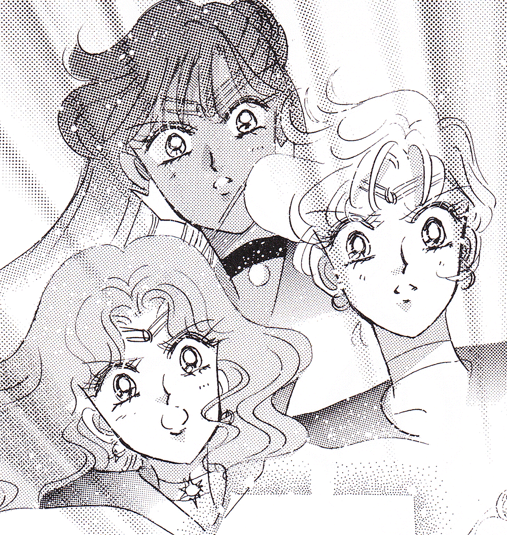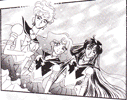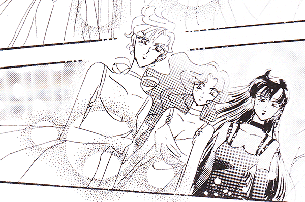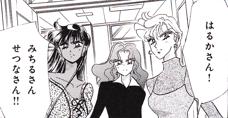 Black & white manga images of Haruka, Michiru & others.
