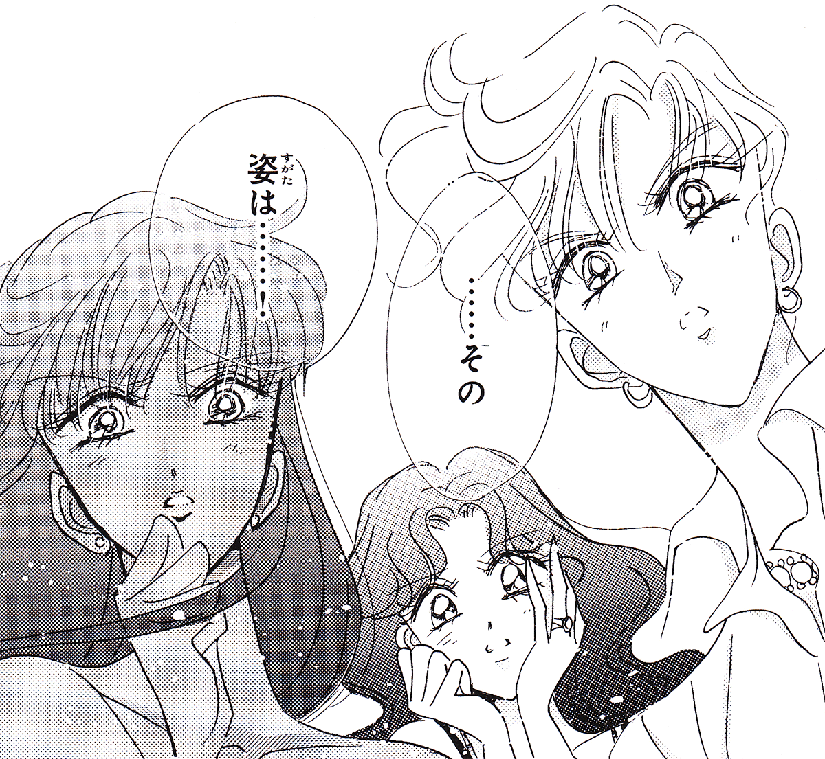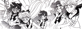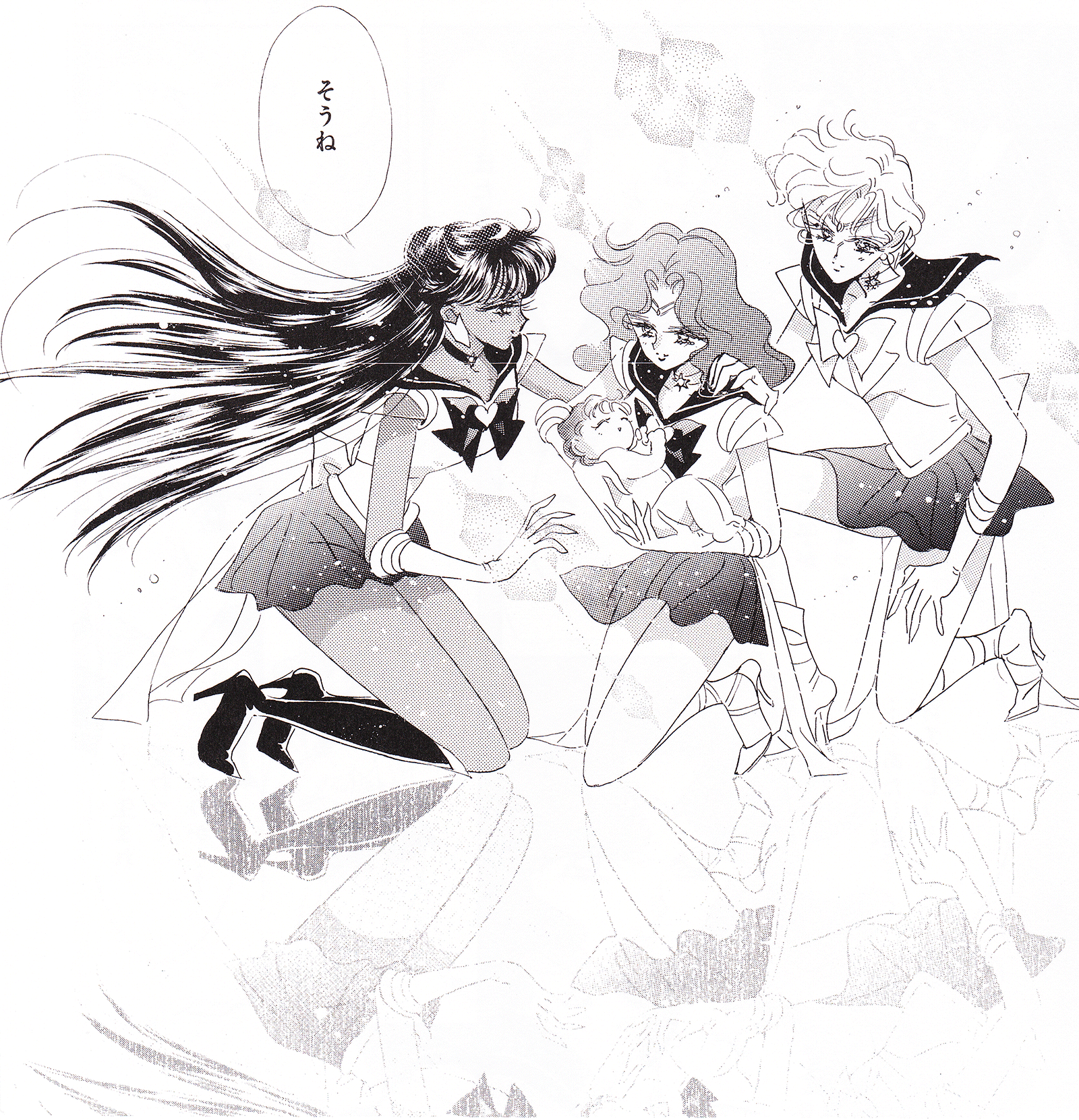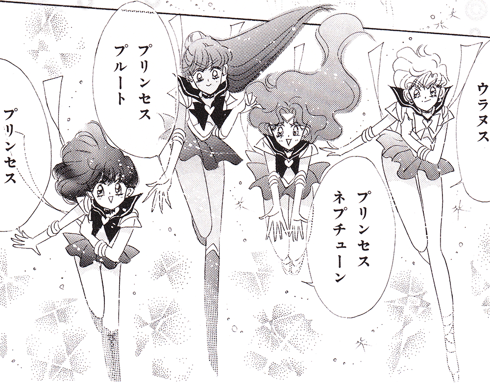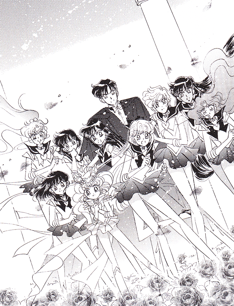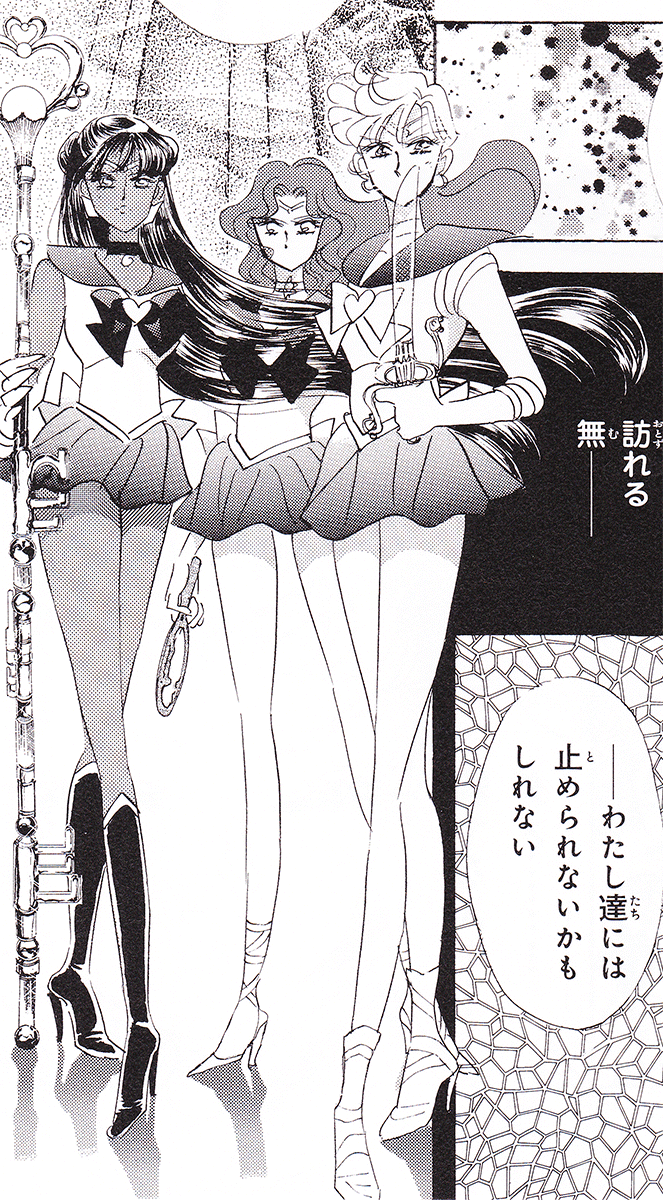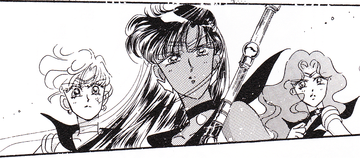 Black & white manga images of Haruka, Michiru & others.