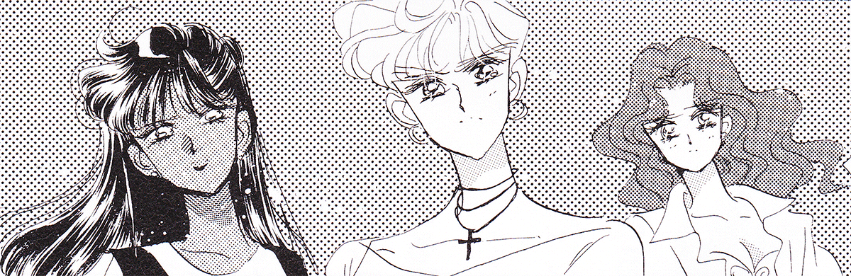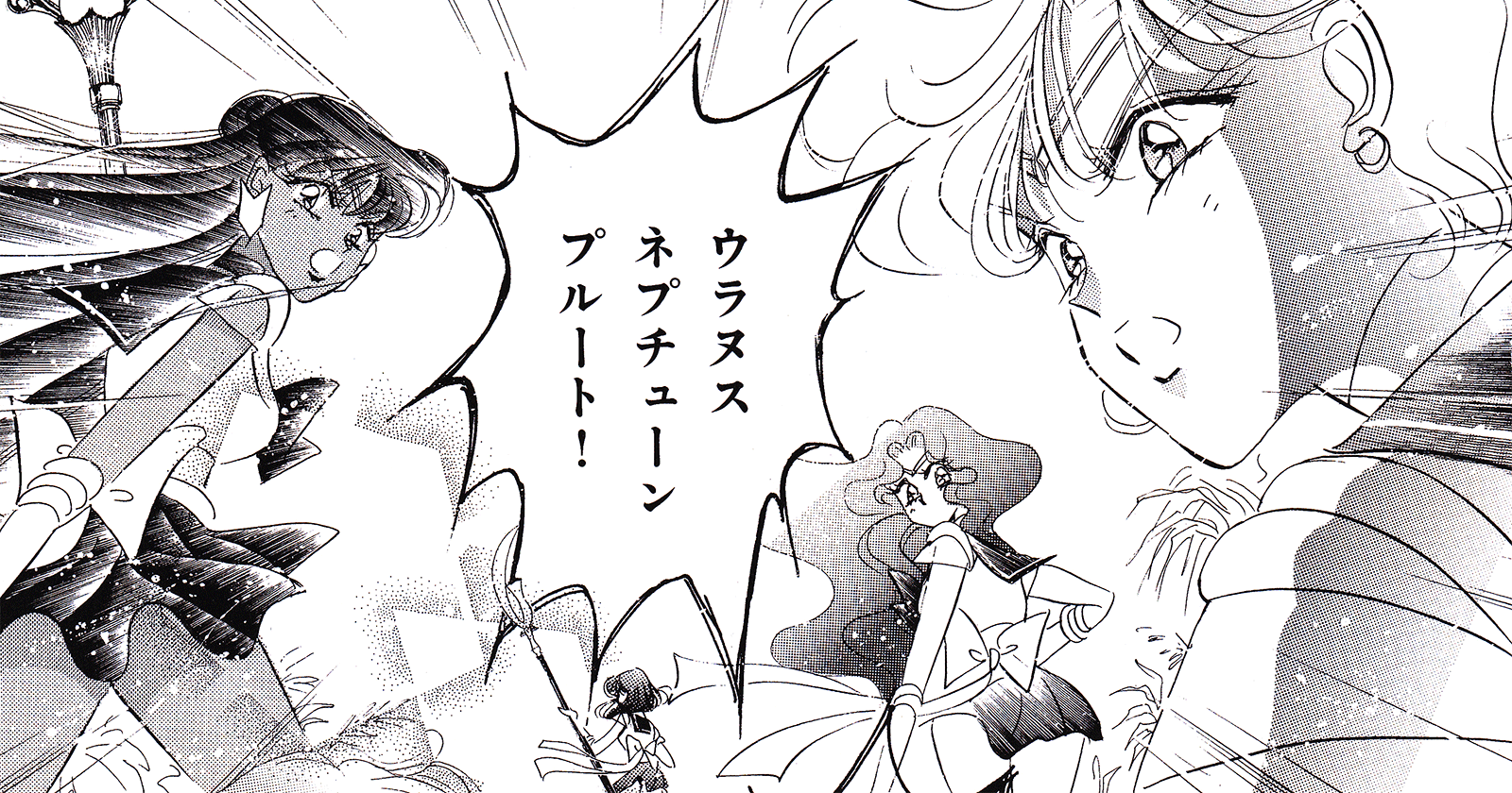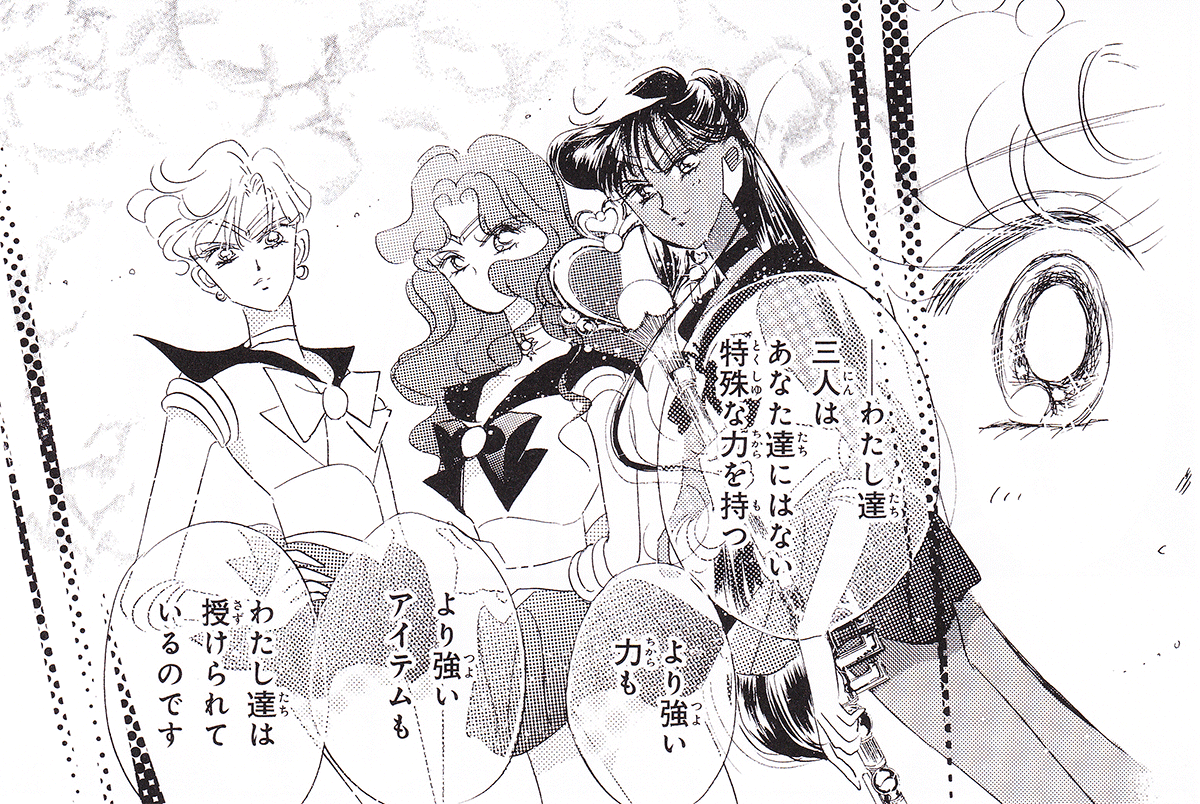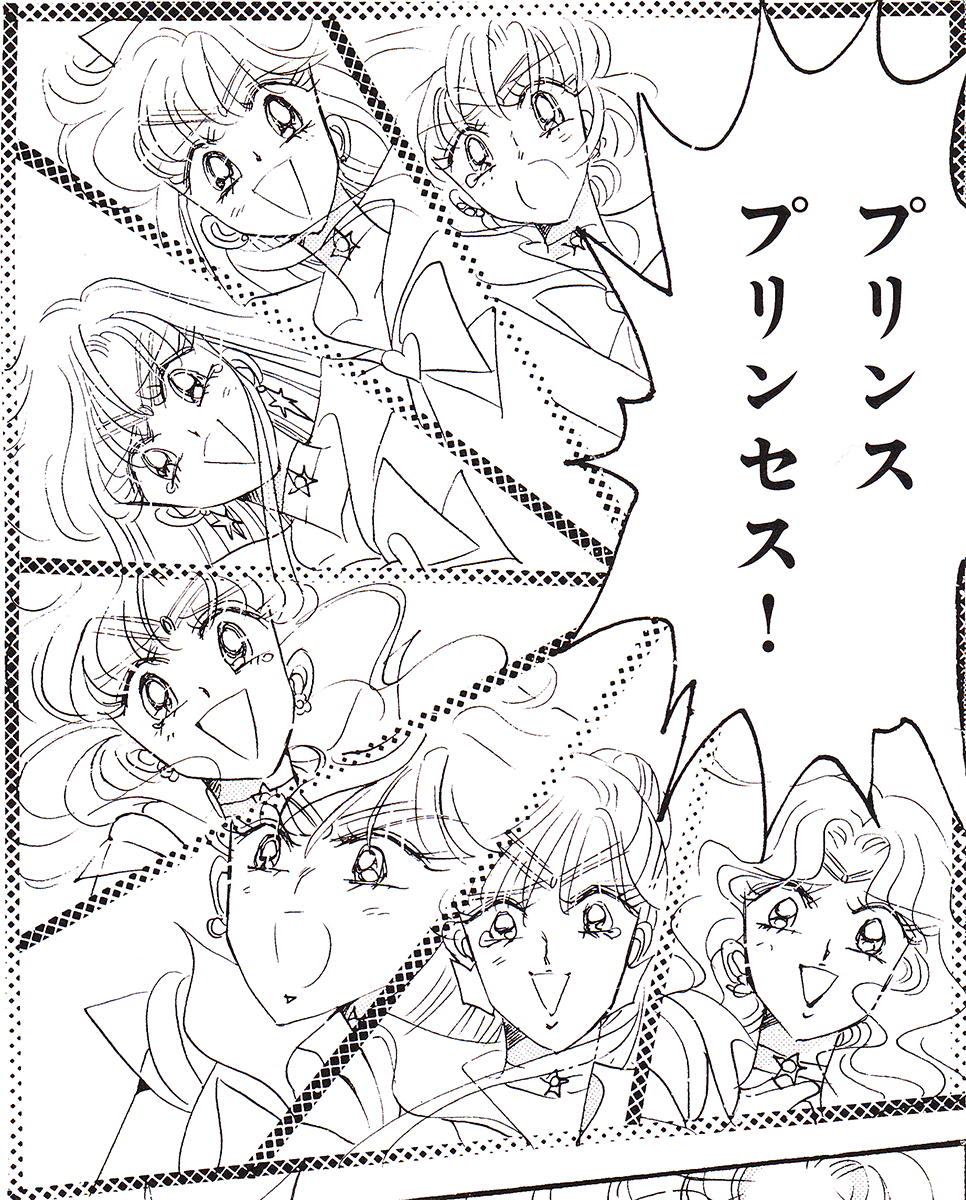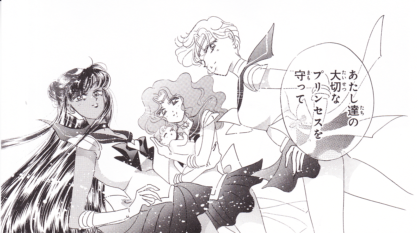 Black & white manga images of Haruka, Michiru & others.