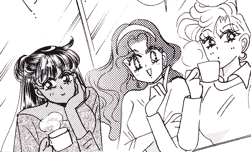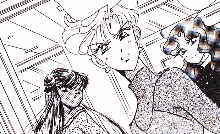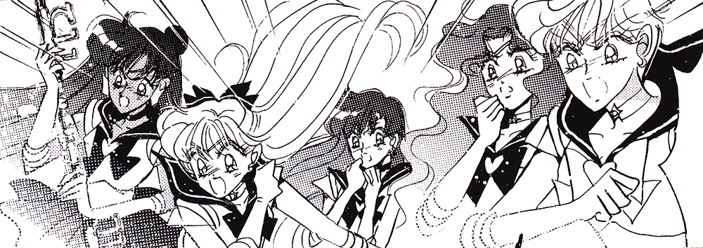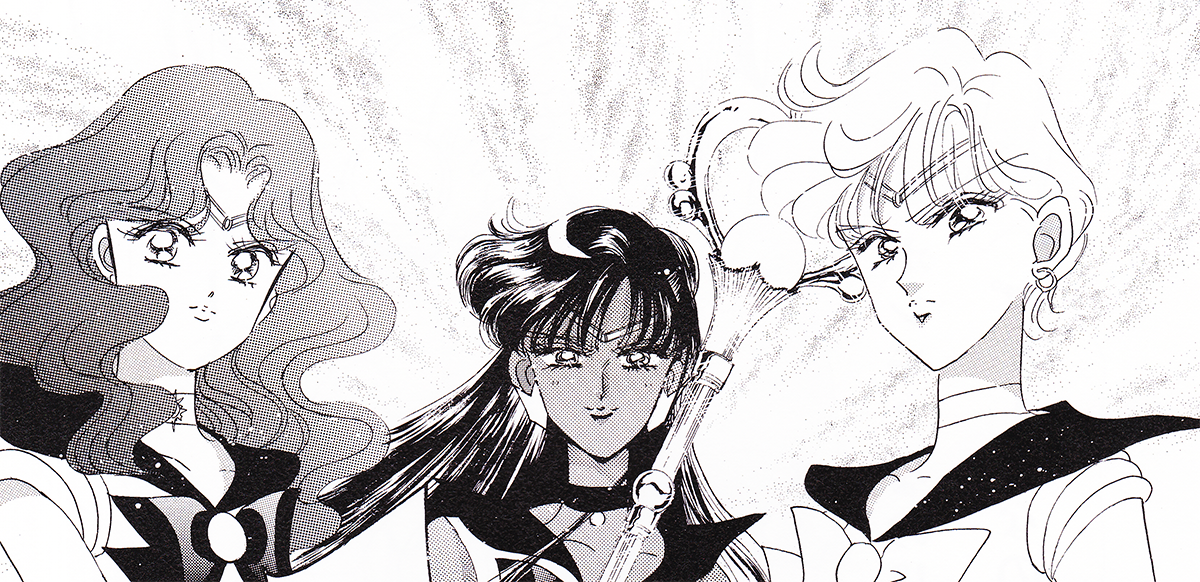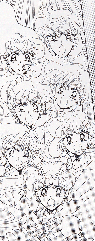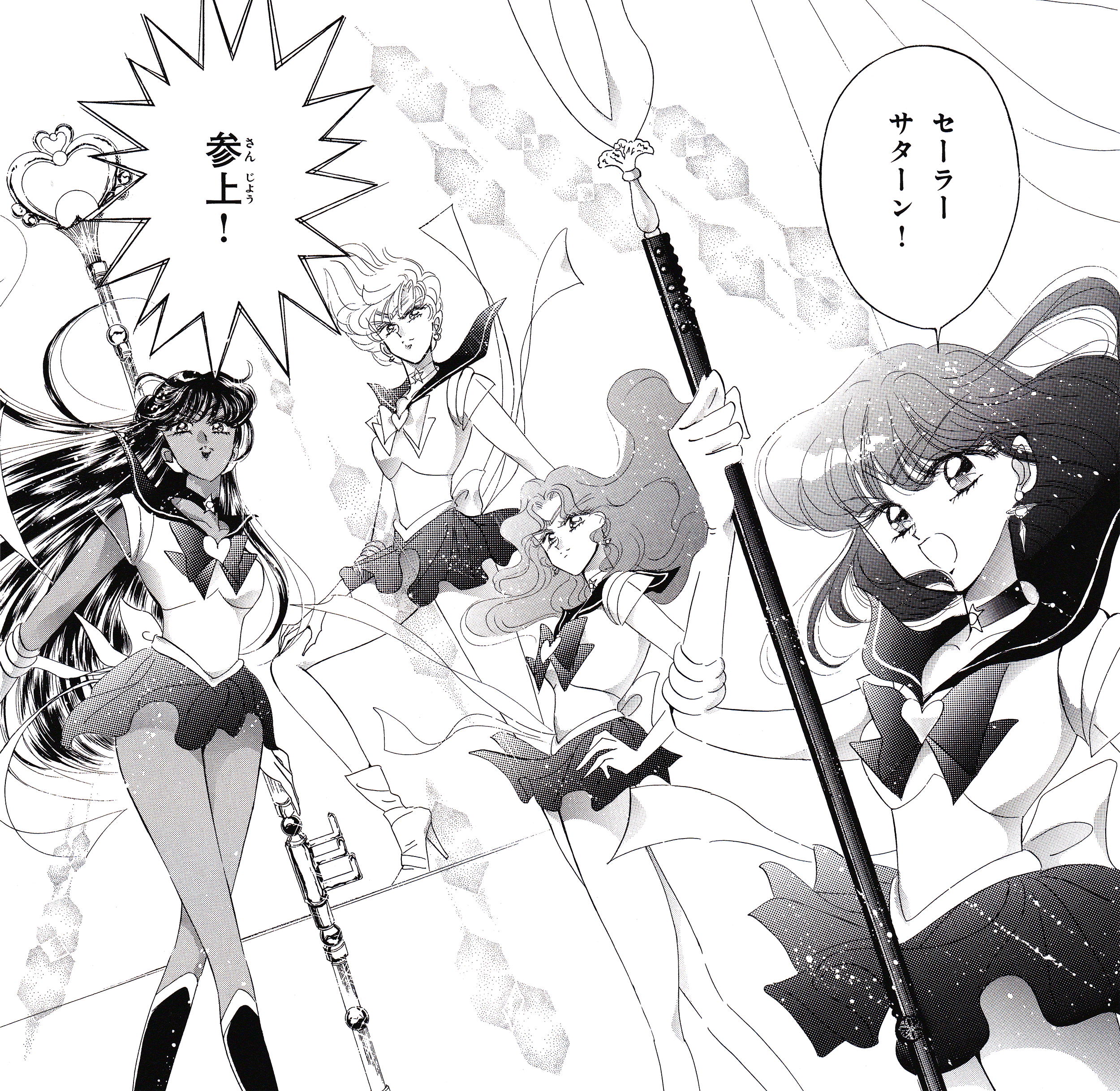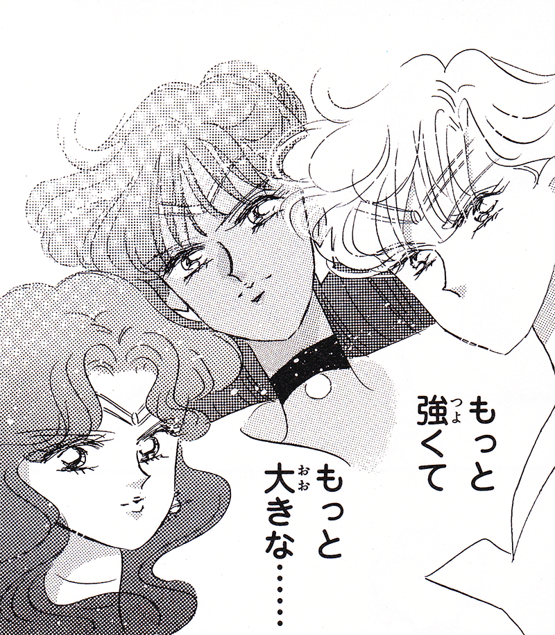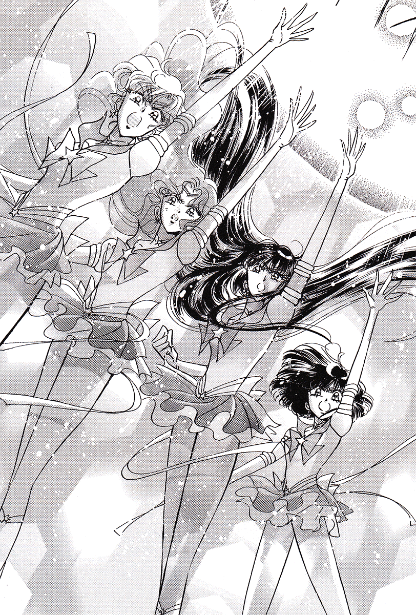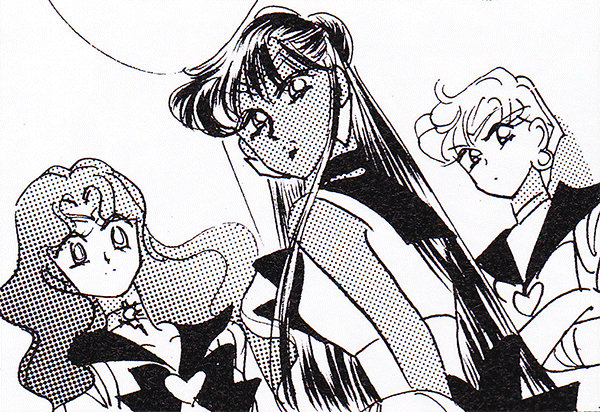 Black & white manga images of Haruka, Michiru & others.