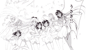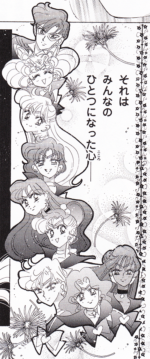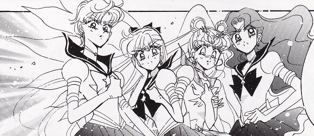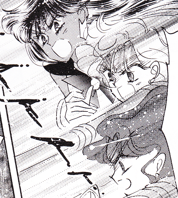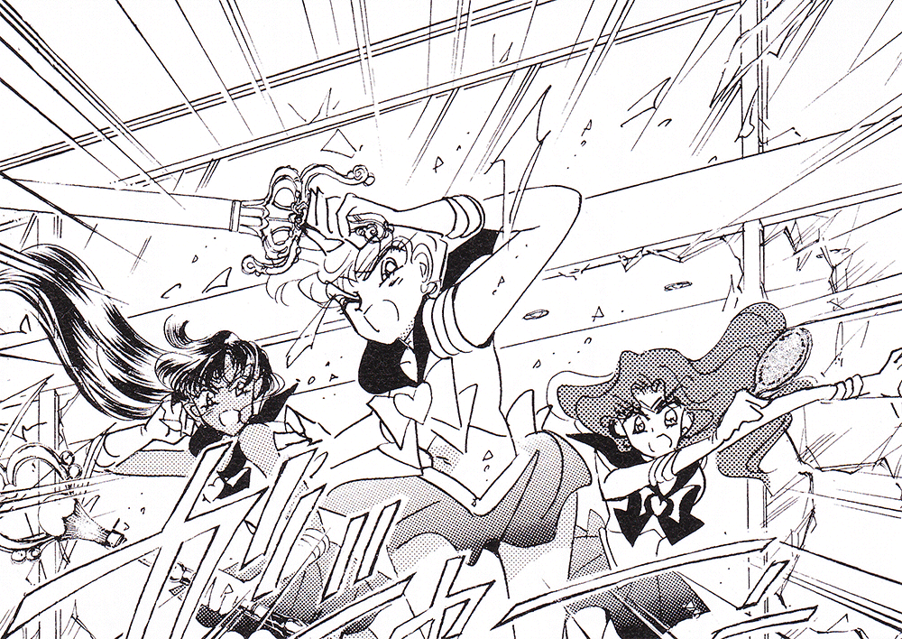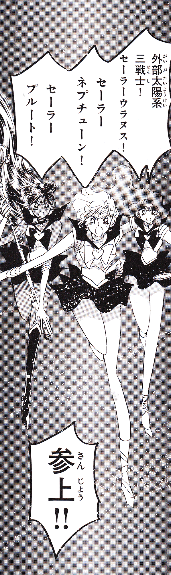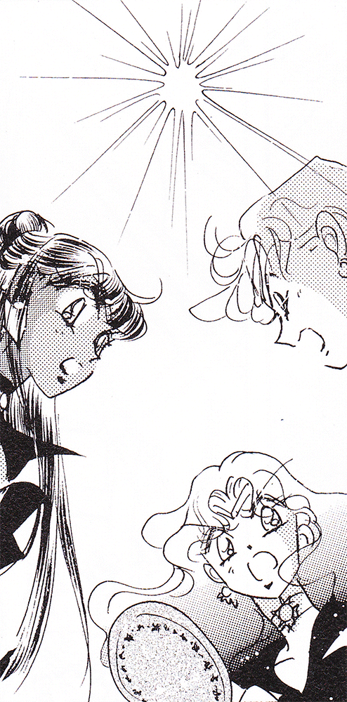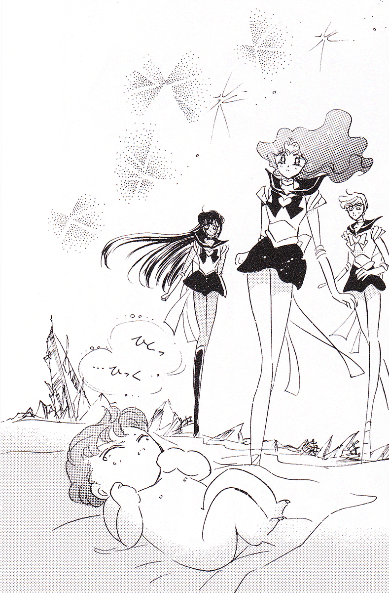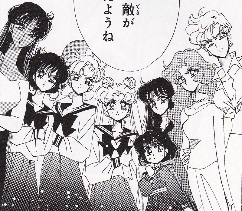 Black & white manga images of Haruka, Michiru & others.