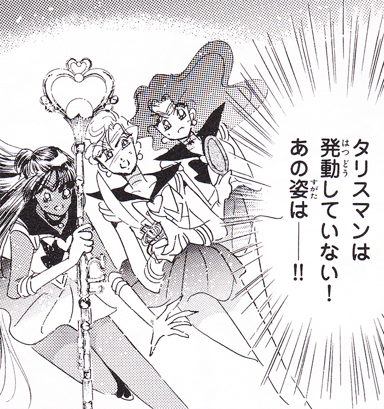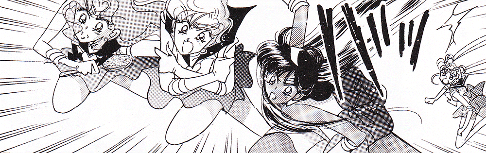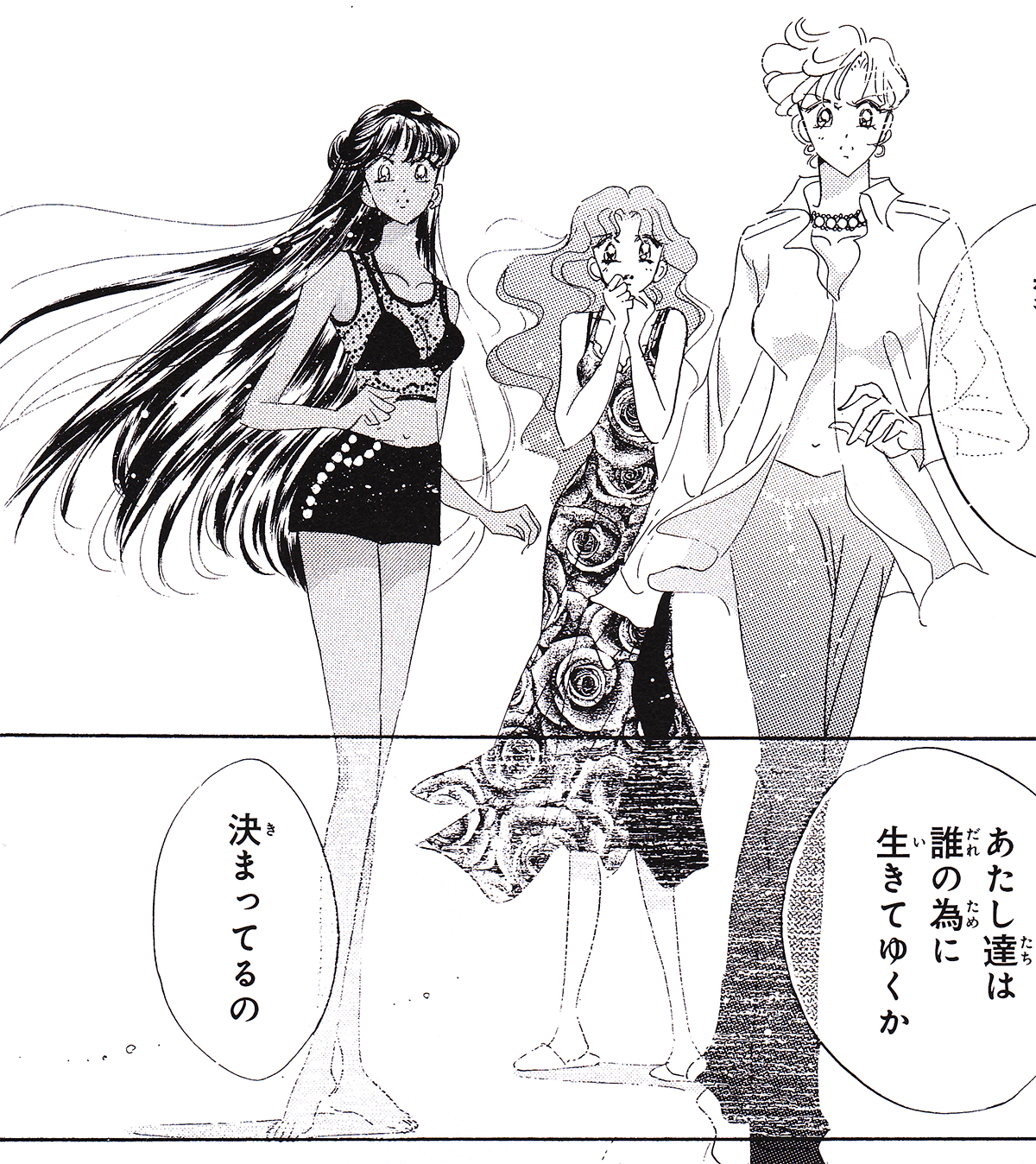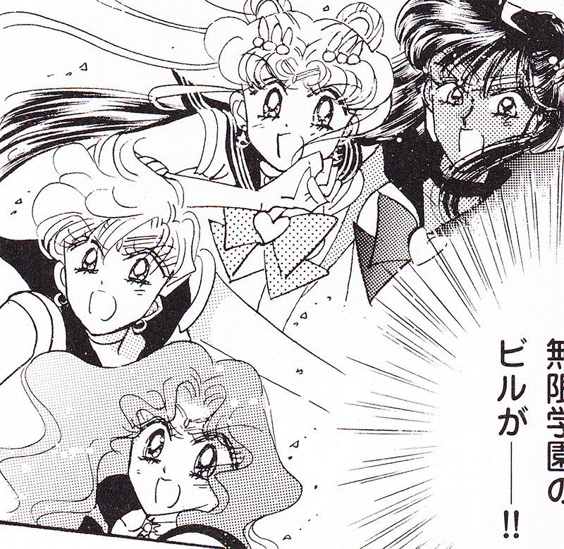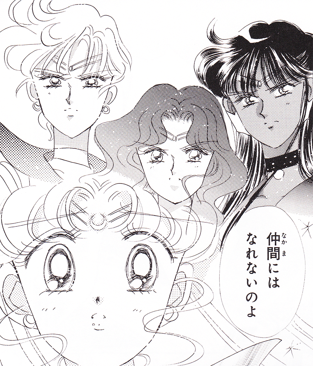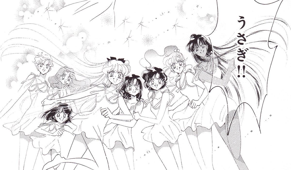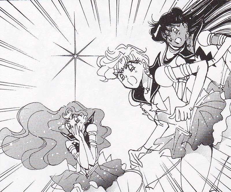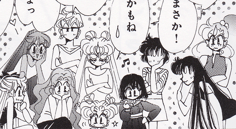 Black & white manga images of Haruka, Michiru & others.