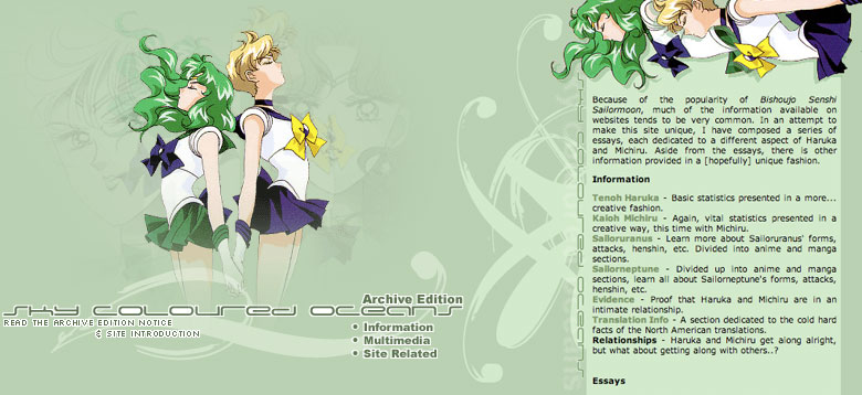 Eventually, I learned how to make my own web sites and the first site I ever made was a tribute to the series on a whole. I had pages for each character with some pictures and information and I was so proud! However, my favouritism for Uranus and Neptune led me to make a web site dedicated to just them. As time passed, I eventually gave up on my general site and focused just on Sky Coloured Oceans. That was back in 1997! I almost couldn't believe it when I sat down to figure it out, but that means Sky Coloured Oceans is about 17 years old at the time of writing this (2014).